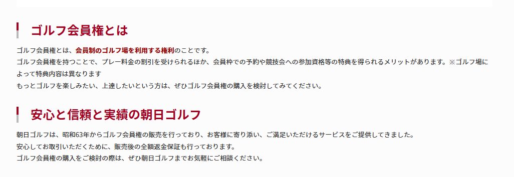 朝日ゴルフは昭和63年創業の老舗で、全額返金保証(平成10年〜)という強い安心材料を明示。はじめての会員権でも失敗しにくい土台が整っています。